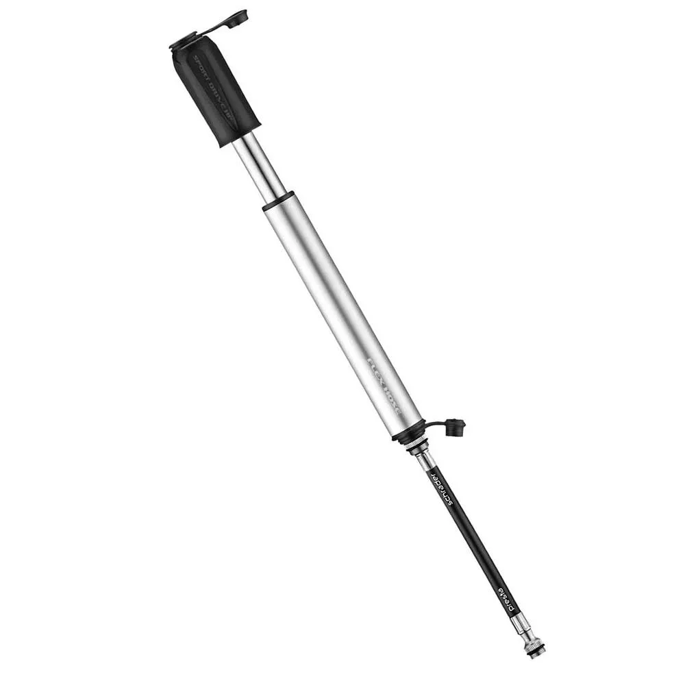Compact pump with overlapping handle, designed for high volume tires. Machined aluminum barrel and piston, composite matrix handle and end caps. Equipped with the Flex hose; Presta and Shrader valve compatible. Includes lightweight composite matrix frame mount.